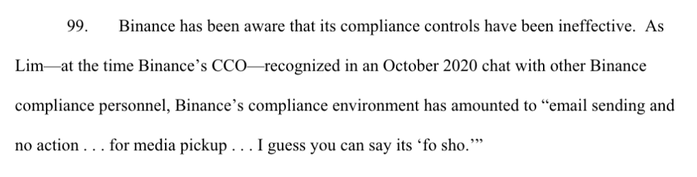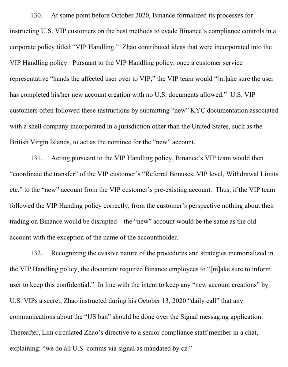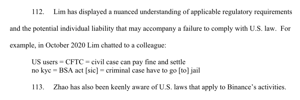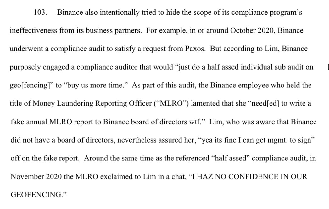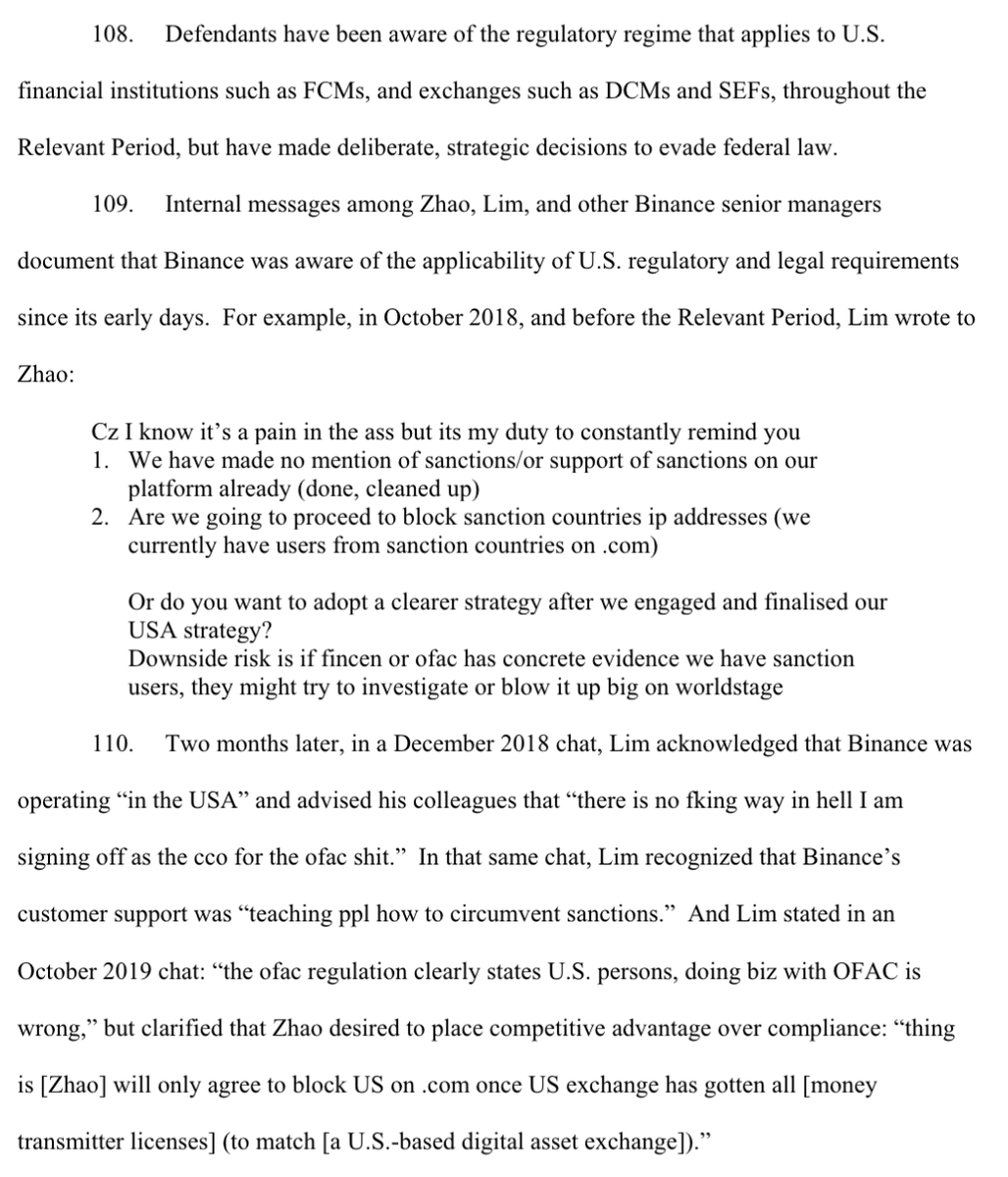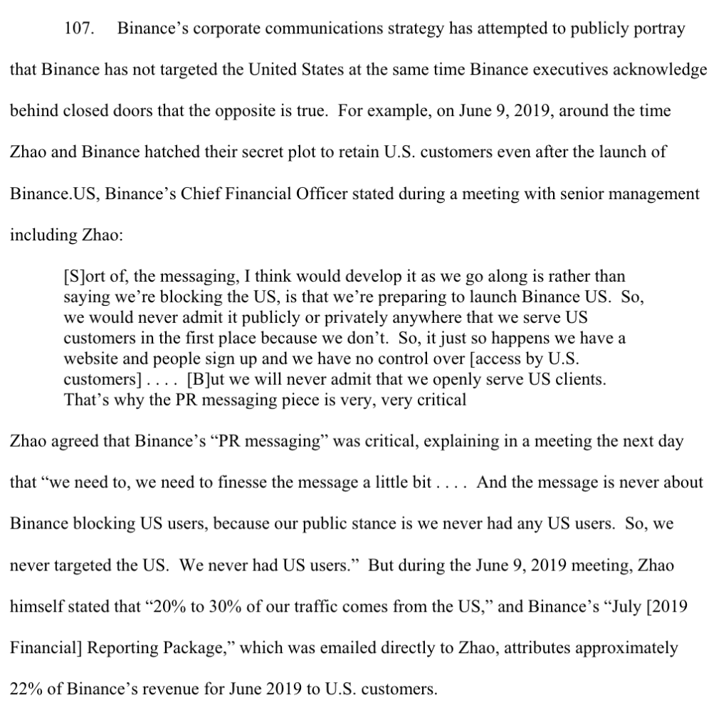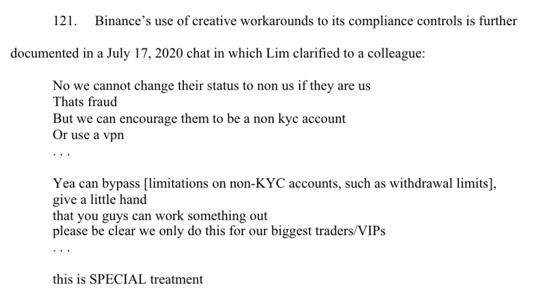 There is a long section on how Binance's know-your-customer (KYC) and restriction of US users is only "for show" — something the CCO explicitly admitted in chat messages.