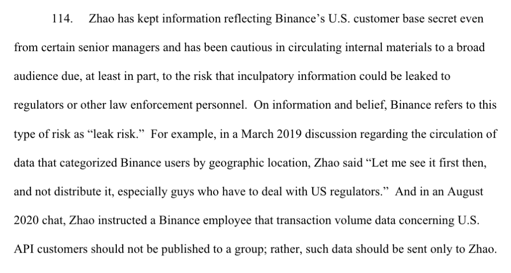 Oops, skipped some stuff. CFTC alleges that CZ keeps some information secret even from high level employees who interact with US regulators to reduce "leak risk"