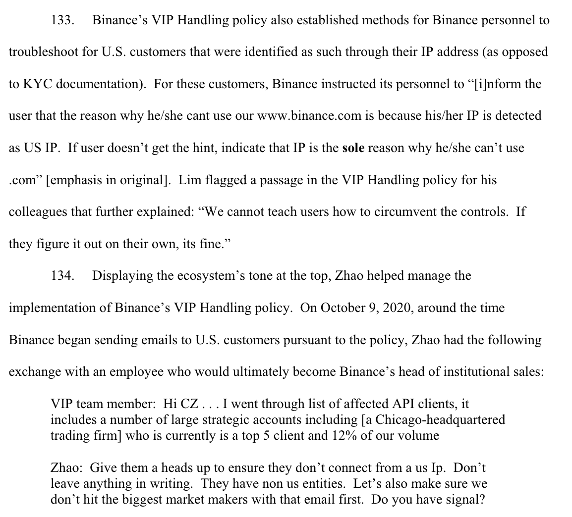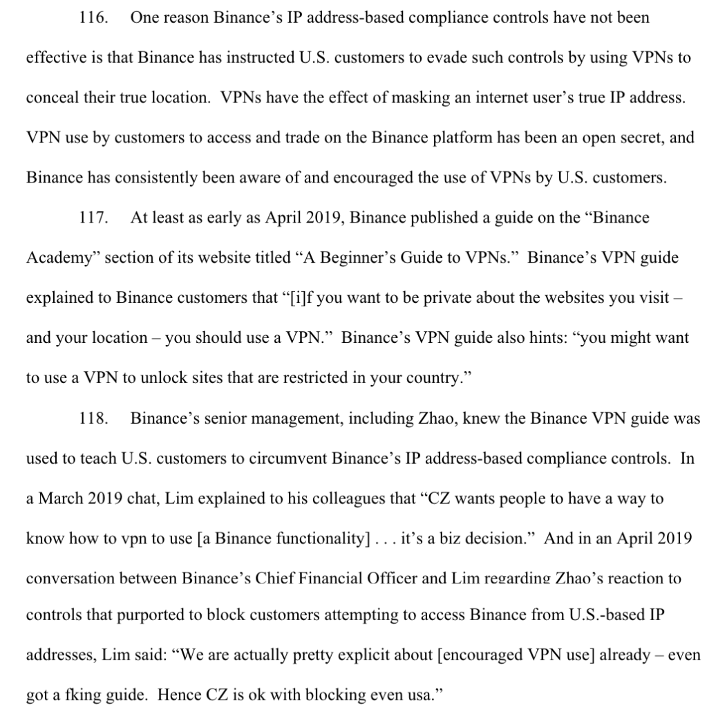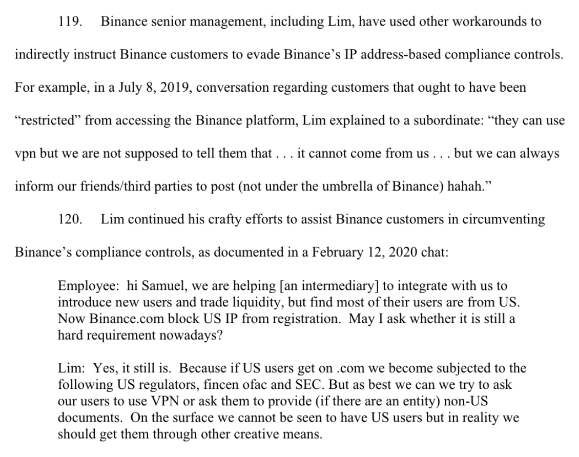 "One reason Binance’s IP address-based compliance controls have not been effective is that Binance has instructed U.S. customers to evade such controls"