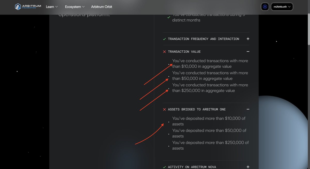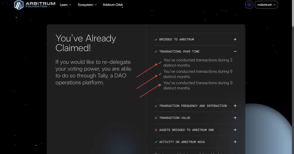 #arbitrum airdrop claim ederken şartlardan bir diğeri de benim aylardır üzerinde durduğum düzenli kullanım şartları idi. Optimism'de aynı şartı koymuştum. Muhtemelen diğer projelerde airdrop yaparken aynı şarları koyacaklar, fotoda gördüğünüz gibi ben 9 ay boyunca işlem yapmıstım