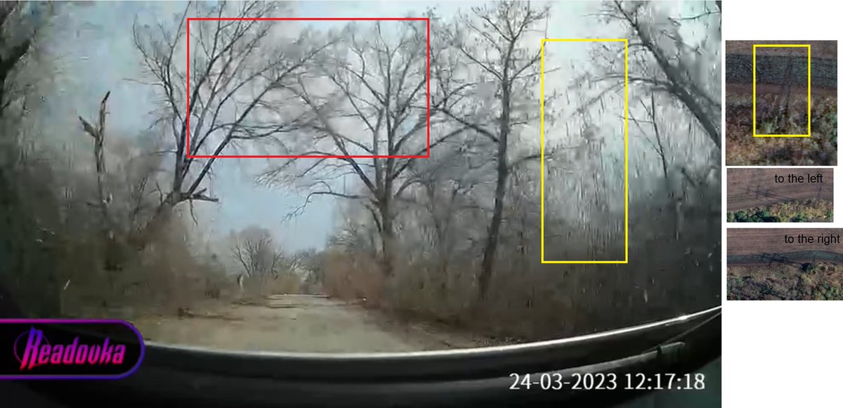 Trees hanging over the road + electricity pylon with very distinct shape. Based on the orientation of the pylon, the lines follow the same direction of the road.