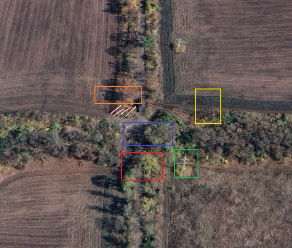 Between the trees, we see another electricity pylon. This time perpendicular to the road. On maps the type of the pylon at this crossroad is not that visible, but the two pylons to the left and right confirm. This is an exact match.