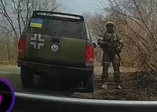 A women and a baby in some civilian car overtook a military column on a road that is to small to pass with two civilian cars?