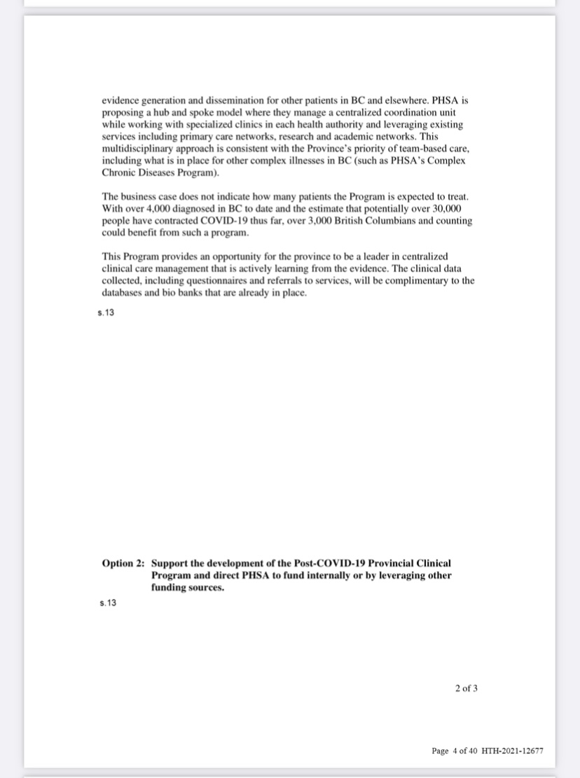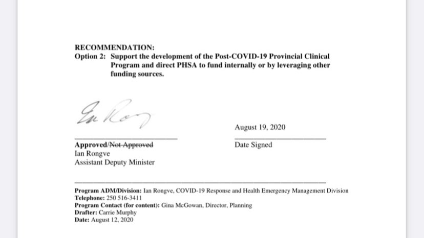 3/ Rongve also explained that although the ministry is aware of the evidence of “an emerging need for post-acute COVID care,” it is “unable to provide the requested funding”. The govt chose “Option 2”- the PHSA is “to fund it internally or by leveraging other funding sources”.