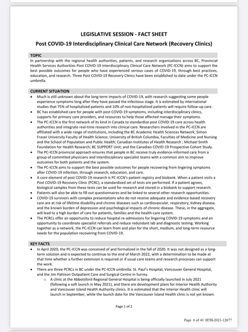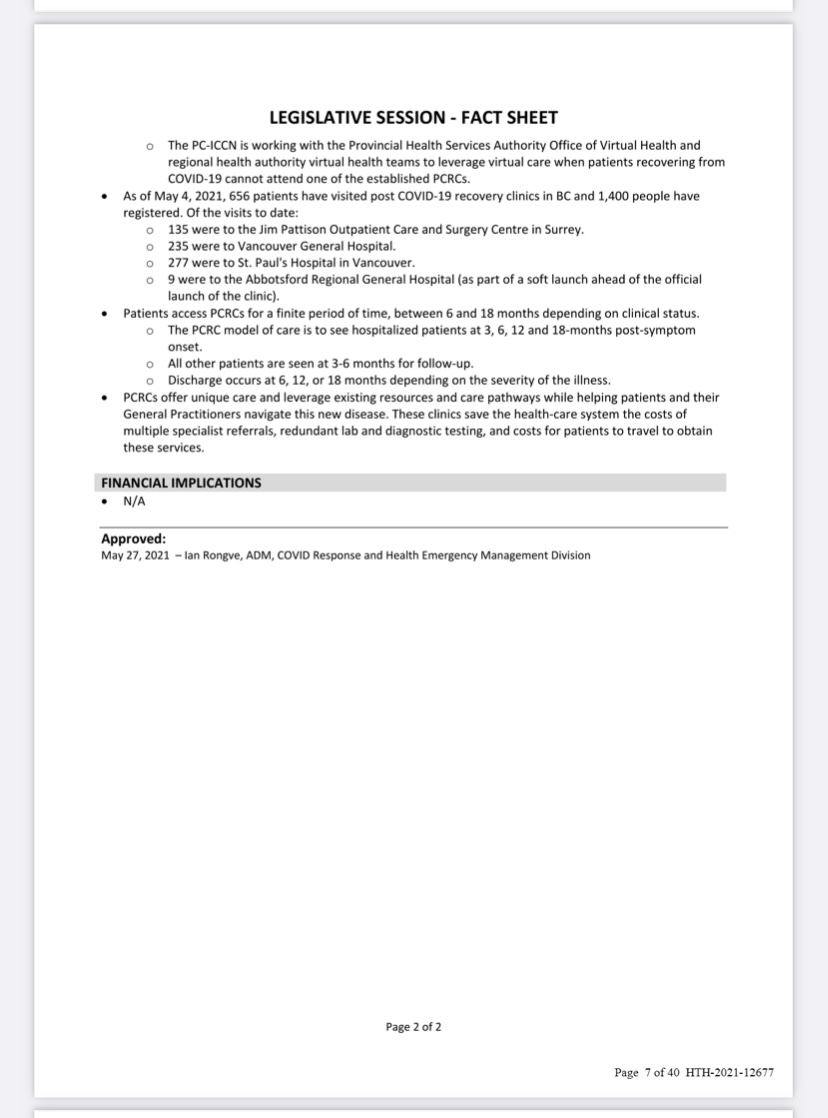 20/ Okay, as promised, there's more. Another revealed document in this same F.O.I is a "legislative session fact sheet" for the Post COVID-Interdisciplinary Clinical Care Network & recovery clinics —approved by Rongve on behalf of the Ministry of Health on May27/21. #bcpoli