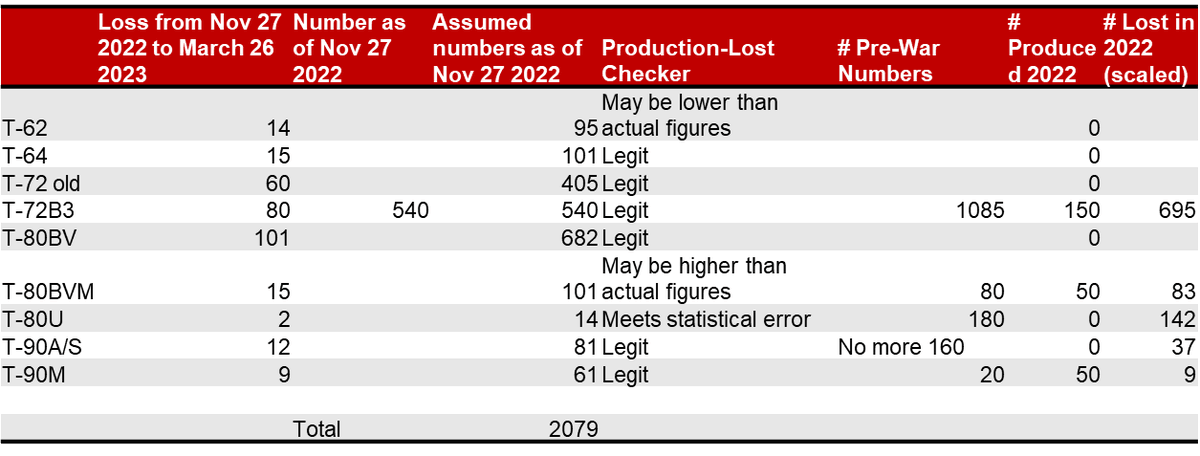 And remember, some 466 (373/0.8) of the Russian tank fleet as of Nov 27 2022 has already been destroyed as of March 26, 2023. And Russia can produce no more than 120 tanks in this 5 month period. Therefore I think the concurrent Russian tank fleet is at 1400~1600 pieces.