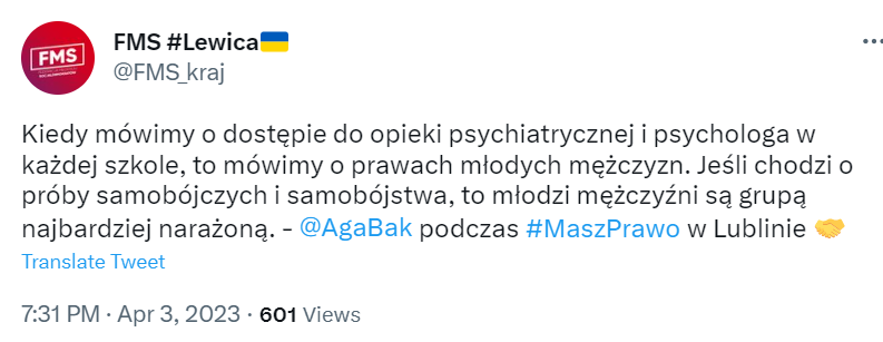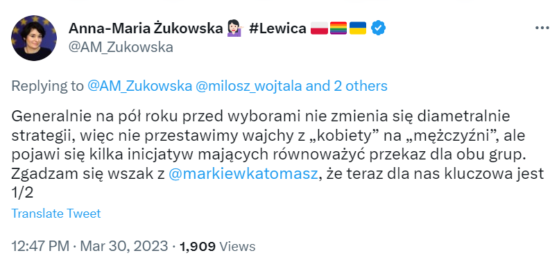 Dopóki Lewica będzie się panicznie wyrażeń "prawa mężczyzn" i "problemy mężczyzn", dopóty będzie dostawała bęcki w wyborach, pzdr.