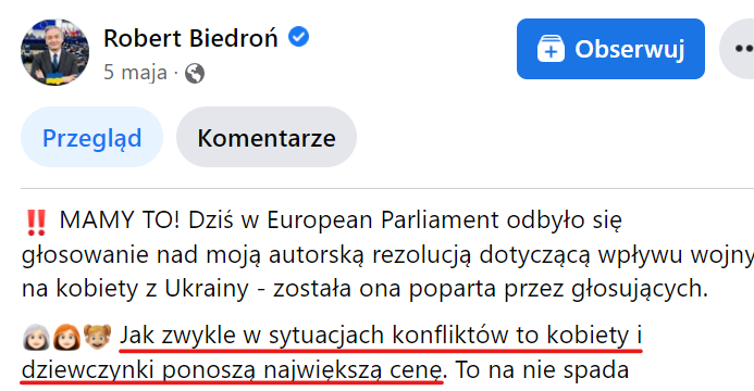 Może dlatego, że mimo zamknięcia granic Ukrainy wyłącznie dla mężczyzn, mimo faktu, że to głównie oni ginęli na froncie oraz jako cywile, zaś kobiety mogły skorzystać z prawa uchodźstwa - Robert Biedroń stwierdził, że to kobiety ponoszą na wojnie najwyższą cenę?