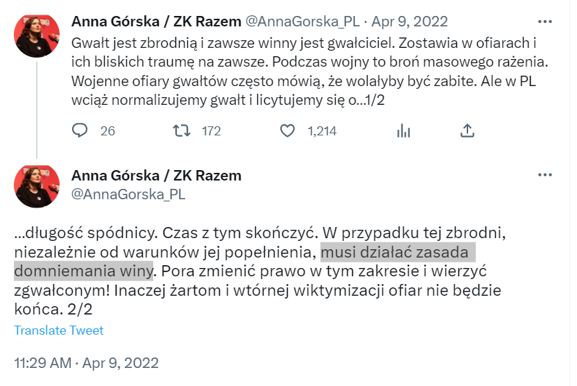 Może dlatego, że członkini zarządu krajowego partii Razem Anna Górska pisała wprost o konieczności wprowadzenia DOMNIEMANIA WINY w przypadku gwałtu, a jej tłita podał profil partii Razem?