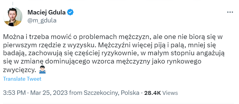 Może dlatego, że poseł Wiosny Maciej Gdula sprowadza problemy mężczyzn do skutków ich indywidualnych decyzji, nie bacząc na to, że przyczyny mogą być systemowe, a nie "faceciki są same sobie winne"?