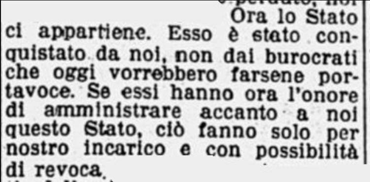 “Abbiamo meritato la nostra fortuna. Ora lo Stato ci appartiene. Noi lo abbiamo conquistato, non i burocrati che oggi vorrebbero farsene portavoce. Se essi hanno l’onore di amministrare accanto a noi questo Stato lo fanno solo per nostro incarico e con possibilità di revoca”.