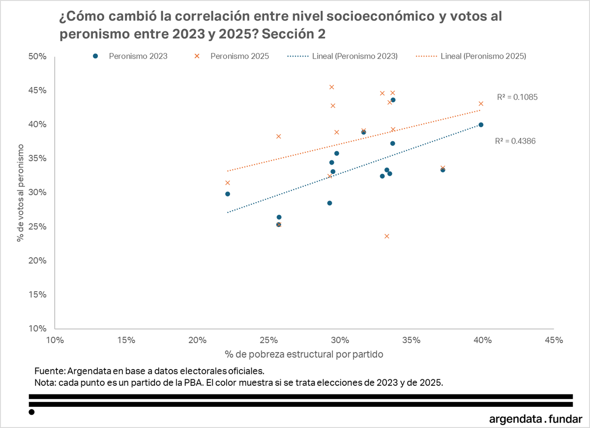 El gráfico muestra cómo la relación entre pobreza estructural por partido y voto al peronismo era bastante fuerte en 2023 (en azul), pero más débil en 2025 (en naranja).