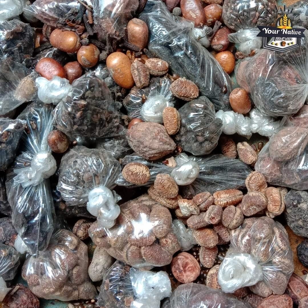 1. Pepper soup species 2. Crayfish 3. Smoked fish 4. Pepper 5. Salt or native salt 6. Maggi 7. Onion (optional) 8. Palm oil