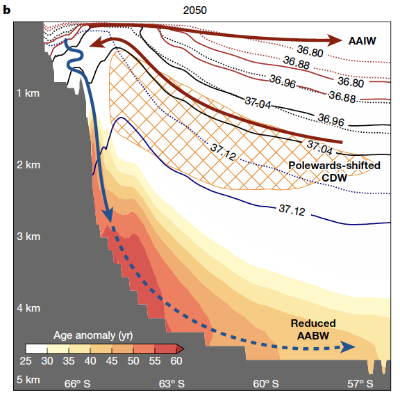 ππ Out today in @Nature our new paper showing how meltwater increases around Antarctica are set to dramatically slowdown the Antarctic overturning circulation, with a potential collapse this century. nature.com/articles/s4158β¦ Aπ§΅on how this work came about and what we found...