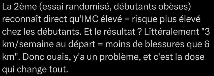 Dans sa contre-argumentation, “Madame Maman” dit que c’est “la dose qui change tout”. Signe qu’elle n’a pas bien compris l’étude. Il ne s’agit pas de “la dose” en absolu, mais bien de la dose avec laquelle on COMMENCE (la première semaine) un programme d’entraînement en running. La dose a continué à augmenter d’environ 10% par semaine.