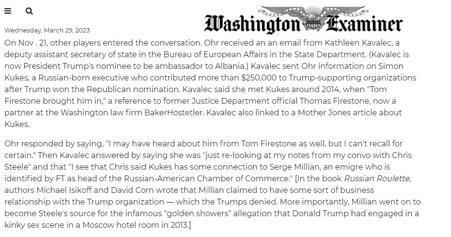 (12) Tom Firestone also tried to introduce Simon Kukes to Kathleen Kavalek and Bruce Ohr. Or said, "I may have heard about him from Tom Firestone". Kavalek, "I see that Chris (Steele) said Kukes has some connection to Serge Millian"