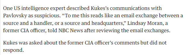 (15) Kukes would later say he only donated to Trump to make "contacts in Houston". It has been suggested that Kukes could have been working for the CIA or Russian Intelligence according former CIA Officer Lindsay Moran.