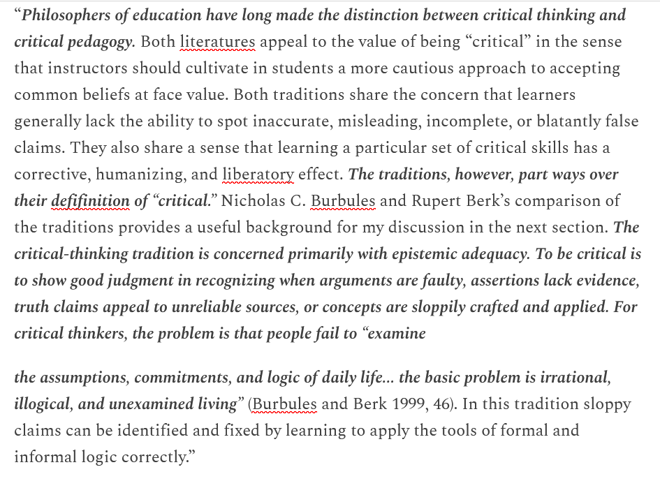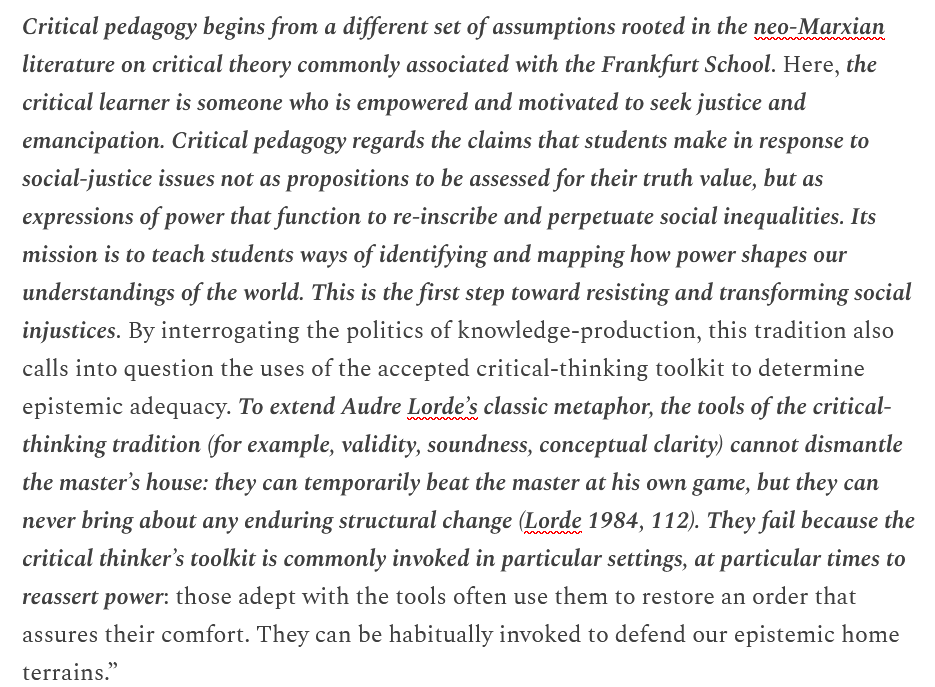 17/ This is why Bailey says: “Critical pedagogy regards the claims that students make in response to social-justice issues not as propositions to be assessed for their truth value, but as expressions of power that function to re-inscribe and perpetuate social inequalities.”