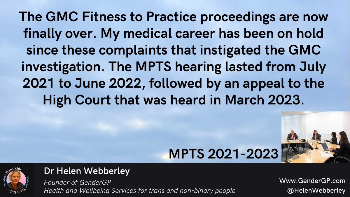 As many of you know, in July 2021 I underwent a comprehensive evaluation of my Fitness to Practice medicine relating to my care of three young transgender patients. The final outcome, determined in the High Court, found my 'fitness to practice was not impaired' as a result of the care I gave. That is, the care I gave in these cases was correct and appropriate.