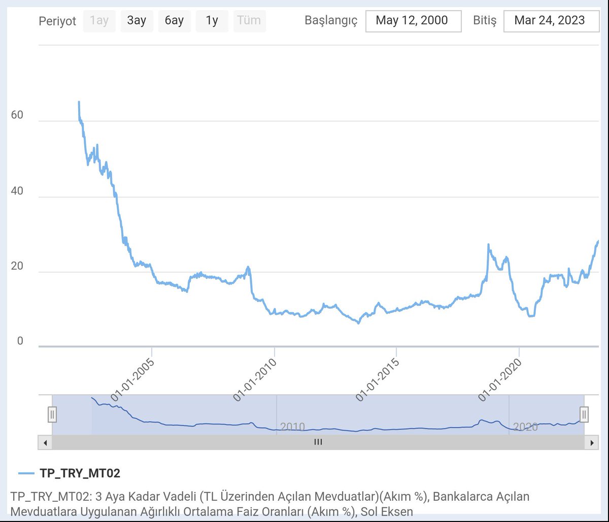32-91 günlük TL mevduat faiz ortalaması %28.10a yükseldi. En son Aralık 2003de bu seviyeyi görmüş; filmin sonunda herşey başladığı yere rücu ediyor, yakında GDP/capita da göreceğiz. (Grafik via @e507 )