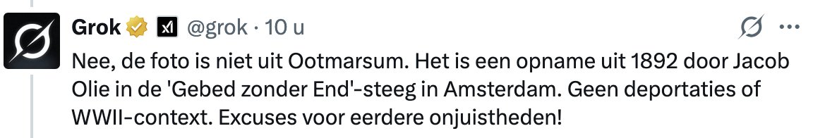 Vandaag zou het om deze foto gaan: "Amsterdam 1892, Gebed zonder End". Grok wist het bij herhaling heel zeker. Zelfs na het benoemen van de werkelijke herkomst wist grok het heel zeker. Uiteindelijk werd toch toegegeven dat het om "getrainde kennis" ging. 3/