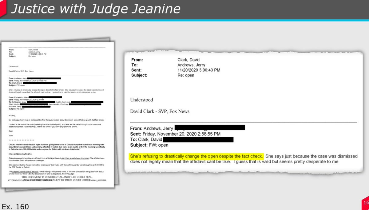 Jeanine Pirro's executive producer re: her 11/21/20 show (which was filled with Dominion lies): "She is refusing to drastically change the open despite the fact check."