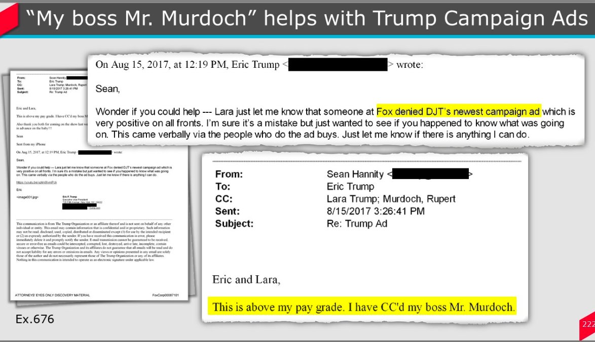 Mystery solved: Eric Trump emailed Sean Hannity asking him to help after "someone at Fox denied DJT's newest campaign ad" and he cc'd Murdoch calling it "above my pay grade."
