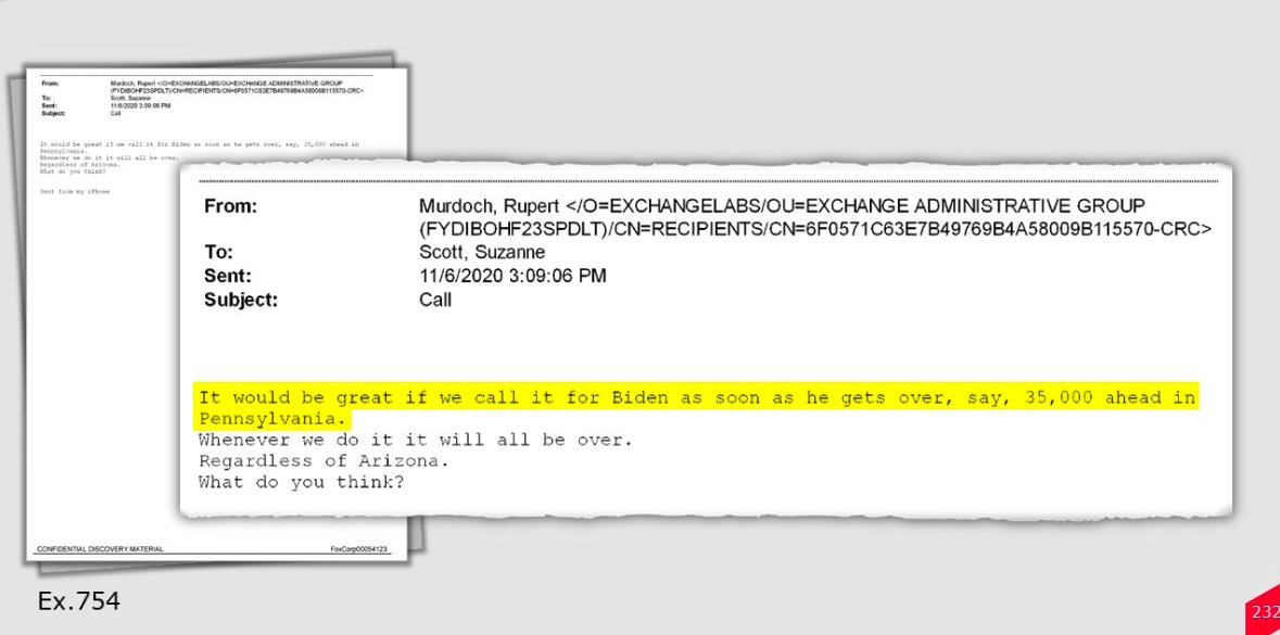Previously redacted 11/6/20 Rupert-to-Scott email: It would be great if we call it for Biden as soon as he gets over, say, 35,000 ahead in Pennsylvania. Whenever we do it it will all be over. Regardless of Arizona."