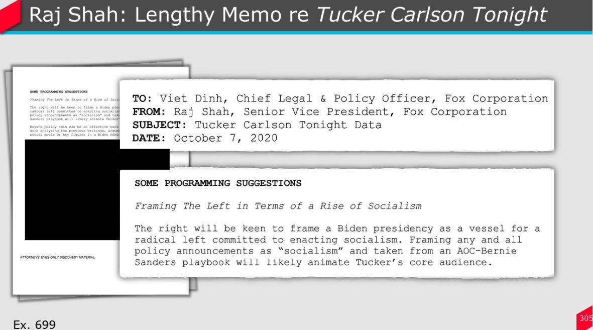From a previously redacted October 2020 memo from Raj Shah about Tucker Carlson Tonight: "Framing any and all policy announcements as 'socialism' and taken from an AOC-Bernie Sanders playbook will likely animate Tucker's core audience."