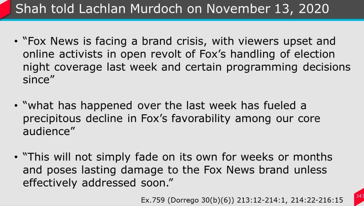 Previously redacted quotes from a Raj Shah memo to Lachlan Murdoch on 11/13/20: "Fox News is facing a brand crisis... open revolt... precipitous decline in Fox's favorability among our core audience... poses lasting damage to the Fox News brand unless effectively addressed soon."