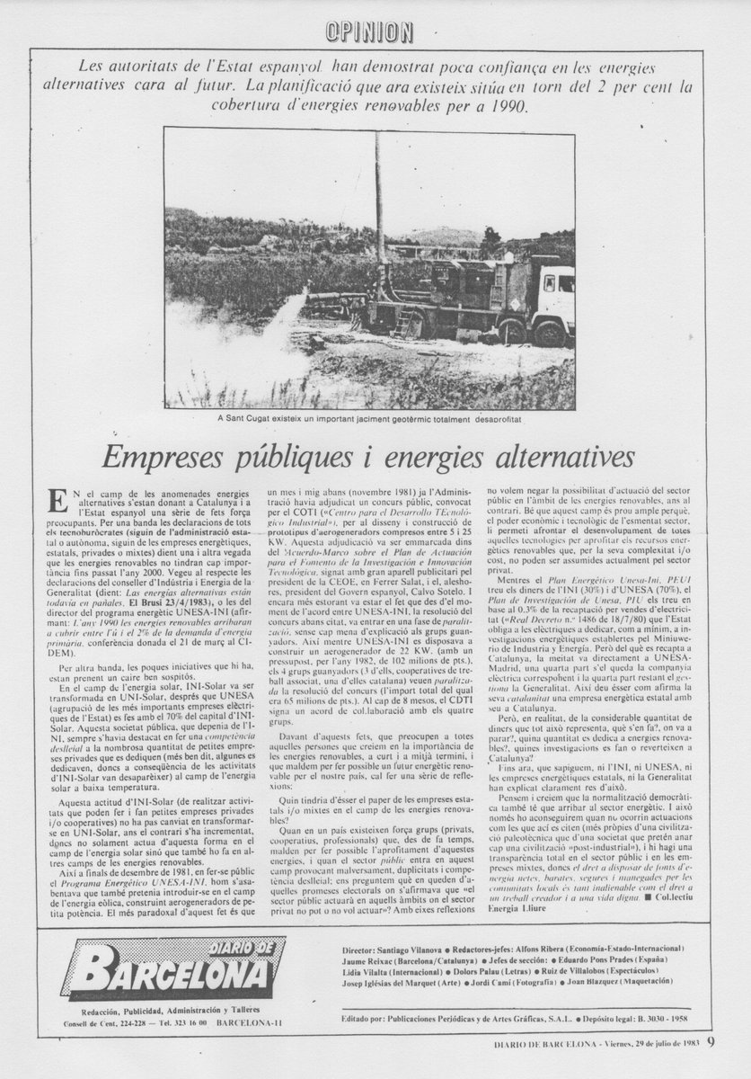 @Viuredelaire el 29/7/1983 vàrem fer aquesta reflexió sobre empreses públiques i energies alternatives en el #DiarideBarcelona. Avui, 40 anys després, continua essent vàlida . . . Image