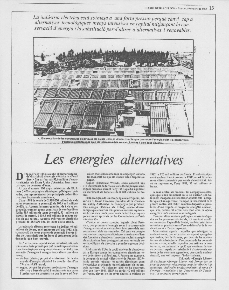 al mes d'abril de 1983, el #DiarideBarcelona publicava l'article Les energies alternatives. Image