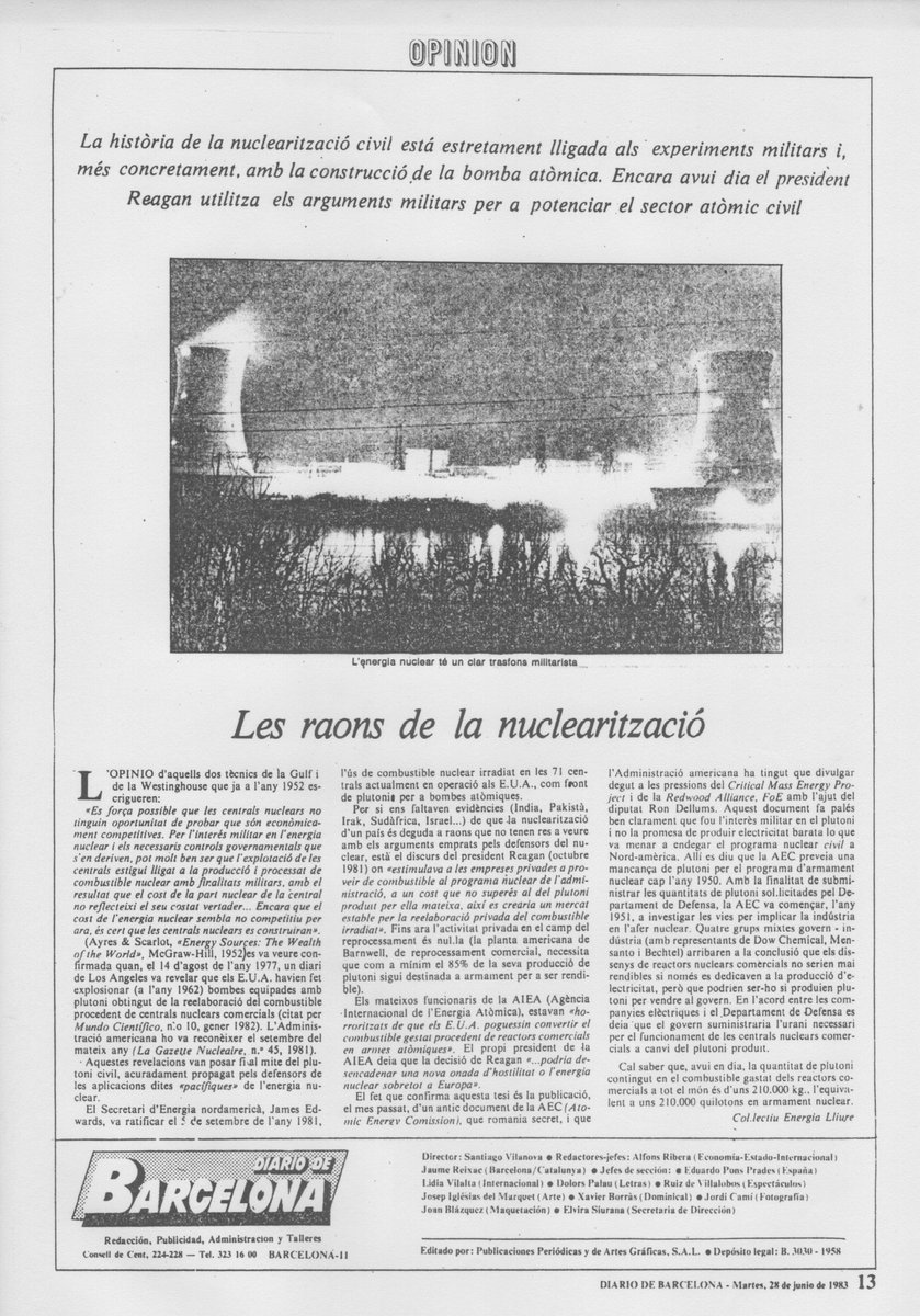 Era l'any 1983, quan els treballadors autogestionaven el #DiarideBarcelona, quan vaig començar a escriure d'energia nuclear i alternatives. Hi vaig fer 9 col·laboracions: 2 signant amb el meu nom i 7 signant amb el pseudònim Col·lectiu Energia Lliure. . . . . .