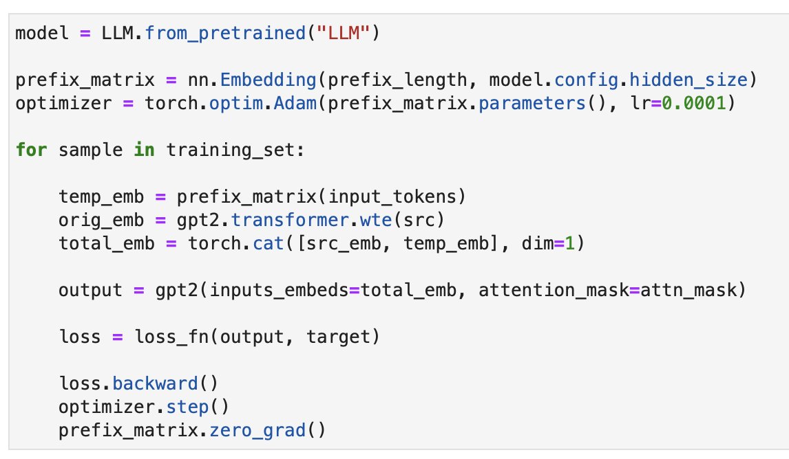In contrast, in Prefix Finetuning, we prepend one or more "virtual tokens," which are continuous, task-specific vectors. We then keep the pretrained LLM frozen and only train the prefix parameters.