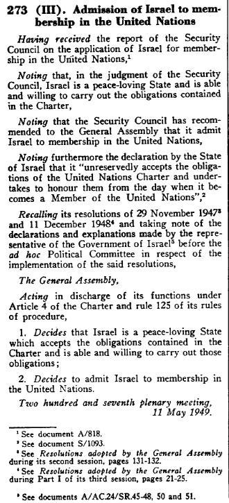 2/6 In reverting to uti possidetis and rejecting Resolution 181, Israel is undercutting the basis of its admission to the @UN, and its duty to comply with the decisions of the Security Council according to Article 25 of the Charter. In May 1949, when it admitted Israel as a Member State of the United Nations, the General Assembly recalled resolution 181 and took note of Israel’s declarations “in respect of the implementation of the said resolution.” Moreover, in November 1967, the Security Council unanimously adopted Resolution 242, which “emphasized the inadmissibility of acquisition of territory by war” and called for the “withdrawal of Israel armed forces from territories occupied in the recent conflict.”
