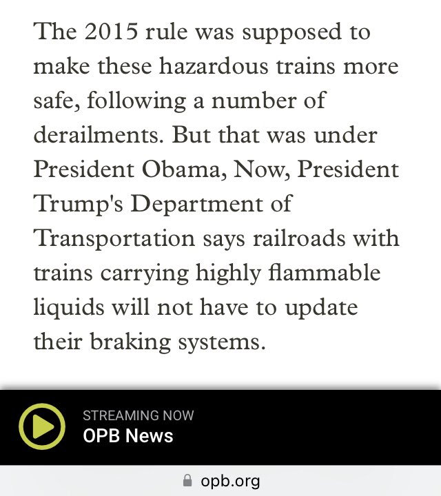 Now, President Trump's Department of Transportation says railroads with trains carrying highly flammable liquids will not have to update their braking systems.