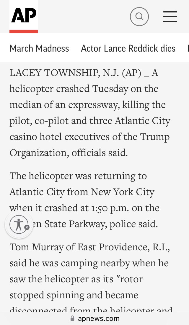 The helicopter was returning to Atlantic City from New York City when it crashed at 1:50 p.m. on the Garden State Parkway, police said.