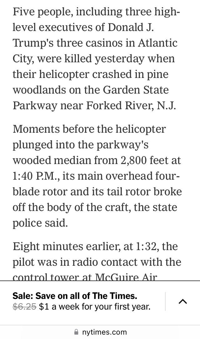 A helicopter crashed Tuesday on the median of an expressway, killing the pilot, co-pilot and three Atlantic City casino hotel executives of the Trump Organization, officials said.