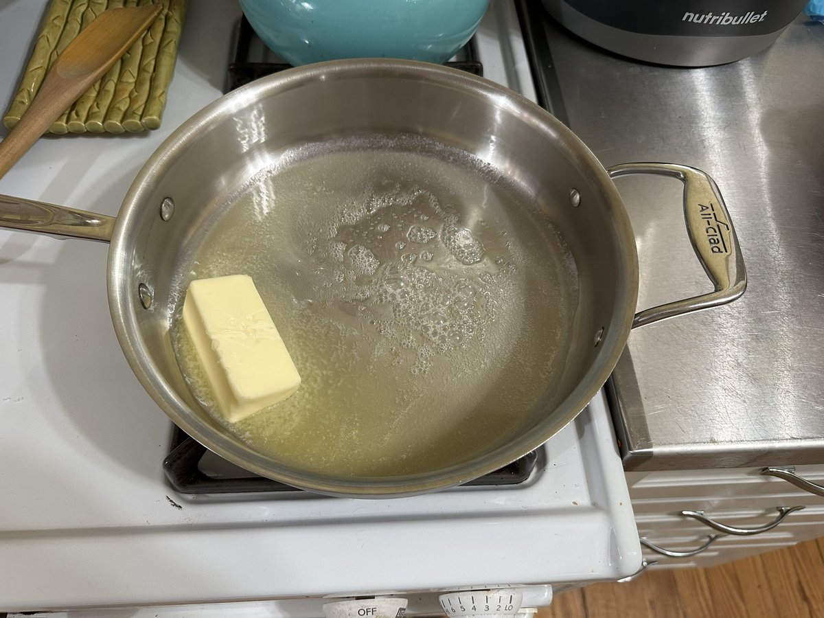 Melt a stick of unsalted butter and then cook down two diced yellow onions & the chili powder. Five minutes or so. Add garlic & ginger. Cook until onions begin to brown. Five minutes or so. twitter.com/i/web/status/1…