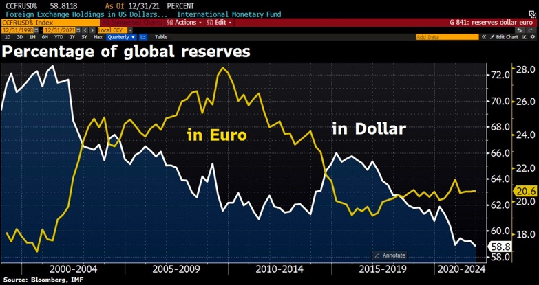 ABD dolarının dünya döviz rezervlerindeki payı son on yılda düzenli olarak azalmakta. IMF verilerine göre küresel döviz rezervlerindeki payı 2011'in 4. çeyreğinde %65'in üzerinde olan ABD doları, 10 sene sonra 2021'in 4. çeyreğinde %62'e düştü.