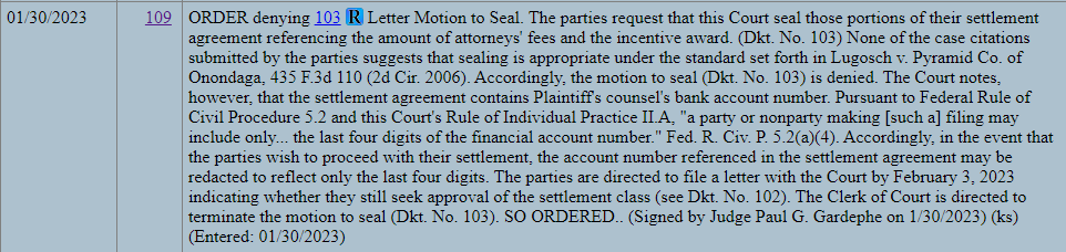 Just in: A NY federal judge denied a request to keep under seal the amount of $ Trump's 2016 campaign agreed to pay in attorney fees and a plaintiff incentive award to settle a long-running fight with an ex-staffer over NDA agreements. More to come