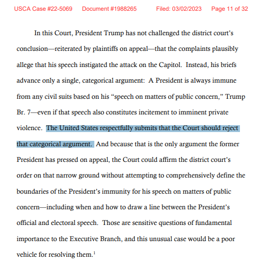 NOW: DOJ won't back Trump's absolute immunity claim against lawsuits seeking to hold him liable for the Jan. 6 attack -- allegations of inciting violence wouldn't fall under presidential duties, US says (w/out taking a position on whether claims are valid) bloomberg.com/news/articles/…