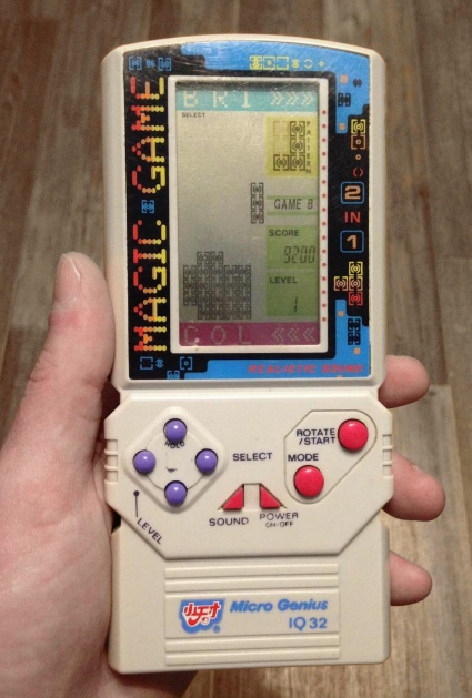 Достоверно не известно, кто первым выпустил тетрисную портативку. Но волне возможно, что TXC. Ее Micro Genius IQ-32 выглядит весьма продвинуто и имеет несколько встроенных игр, включая Tetris, само собой. Поступила в продажу в 1991-92 г.
