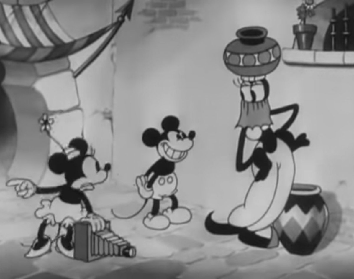 Mickey in Arabia (1932) by Disney, taking place in the Arabian Desert, where Mickey and Minnie are exploring the area I assume. Later, Minnie gets kidnapped by a Sultan. Again, portraying men from SWANA or arab men in this case as predatory and barbaric.