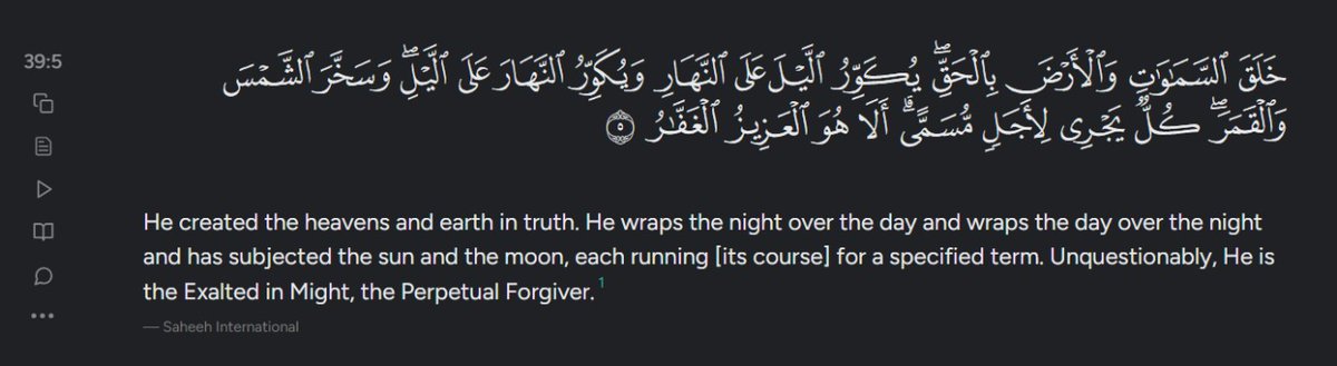 Qur’ān: “He wraps (yukawwiru) the night over the day, and He wraps the day over the night.” This is referring to the alternation of night and day on [2]: the planet as a whole, not just a particular division of land.