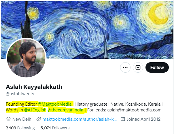 Aslah Kayyalakkath is the Owner of the propaganda and hate website Maktoob Media.