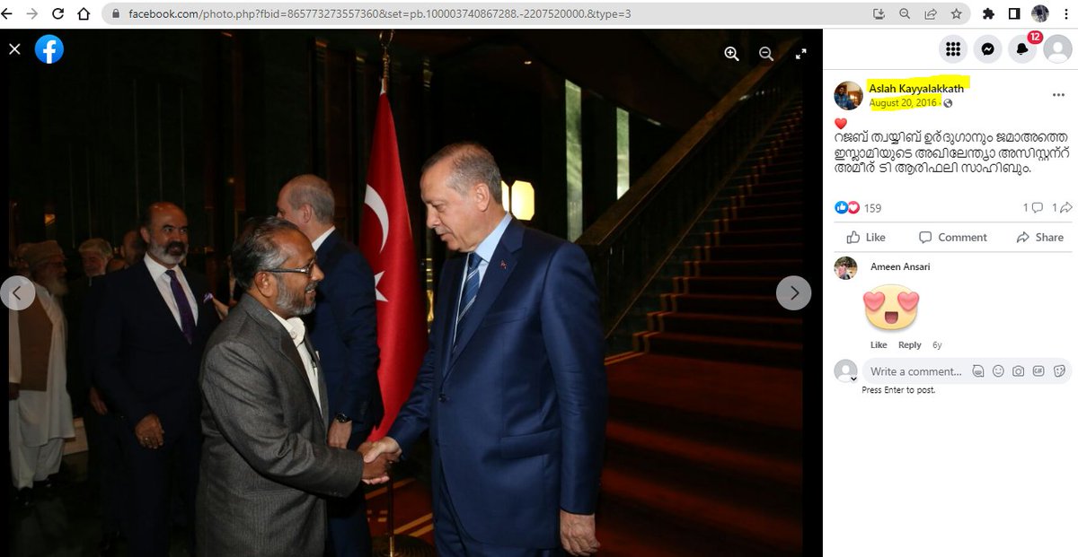 7. In August 2016, Aslah posted a photo of Jamaat-e-Islami Hind Secretary General Arif Ali Thottanchery with Turkey President Erdogan.