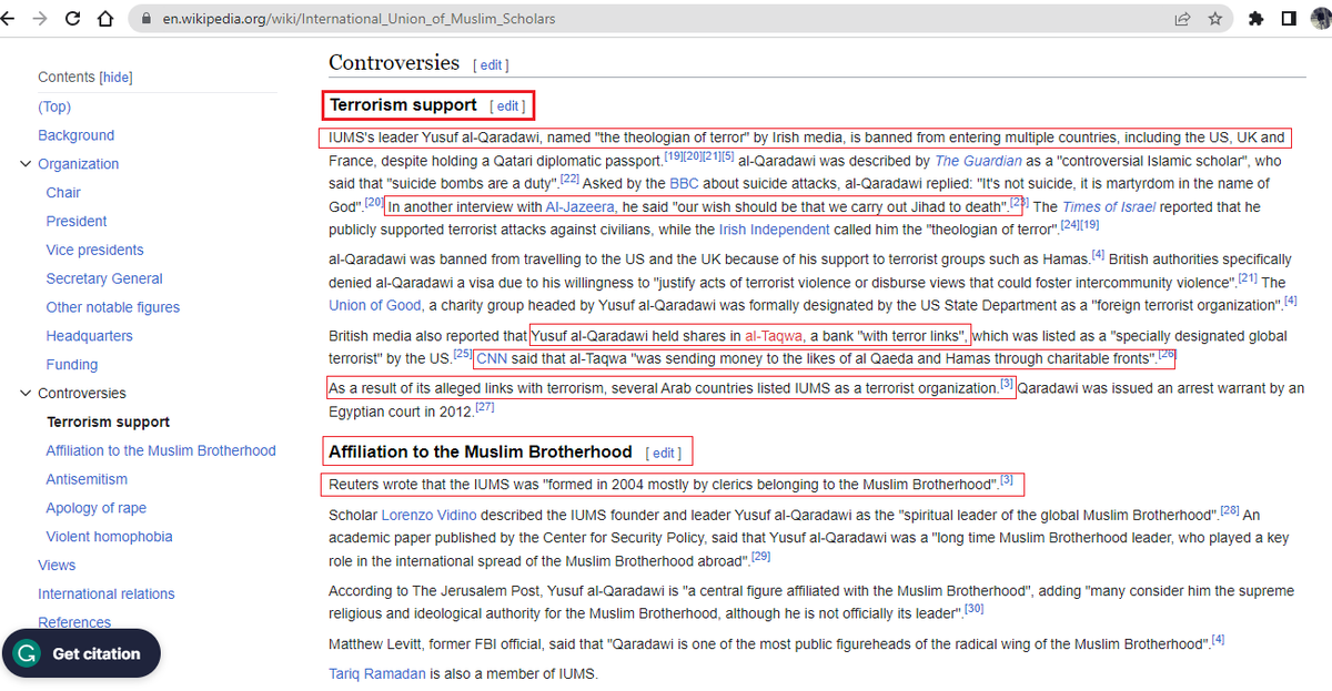 18. IUMS and their founder Yusuf A-Qaradwai with whom Zafarul-Islam is associated, are supporters of the terrorist organization Muslim Brotherhood.