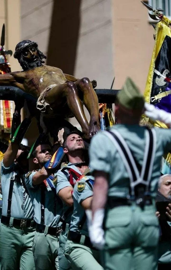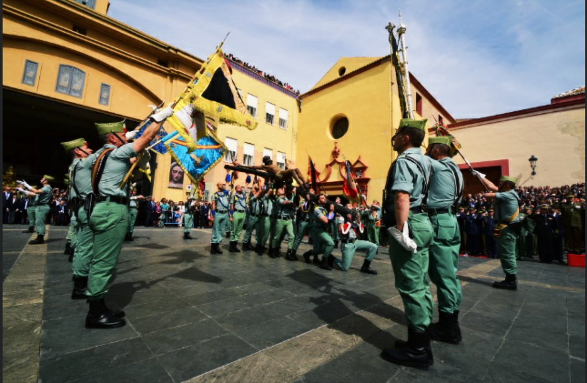 El golpe seco en las culatas de los fusiles retumban en el suelo, el choque del canto de la mano en el pecho del legionario indica el saludo al crucificado, y las palmadas en el guardamanos de los fusiles denotan que se han presentado armas.