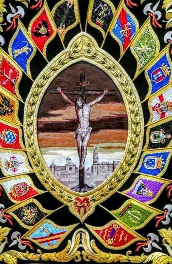 La comitiva se acerca al lugar donde se encuentra el Estandarte representado con el rostro de nuestro salvador, rodeado de las Banderas y Banderines de todos los #Tercios.